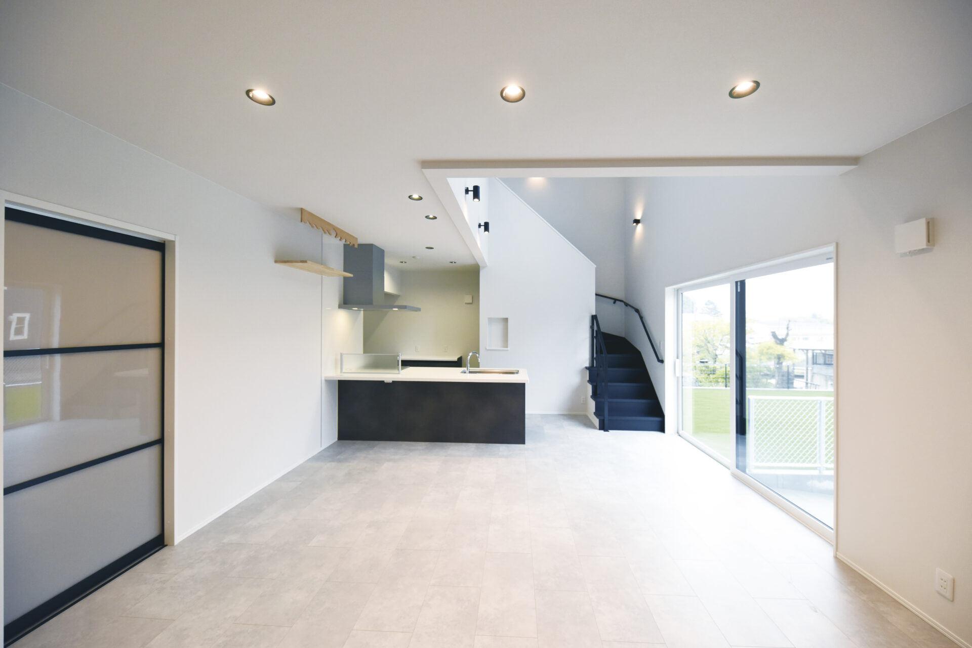 階段のアイアンやダウンライトに「黒」を仕込み、空間全体をスタイリッシュに引き締めました。