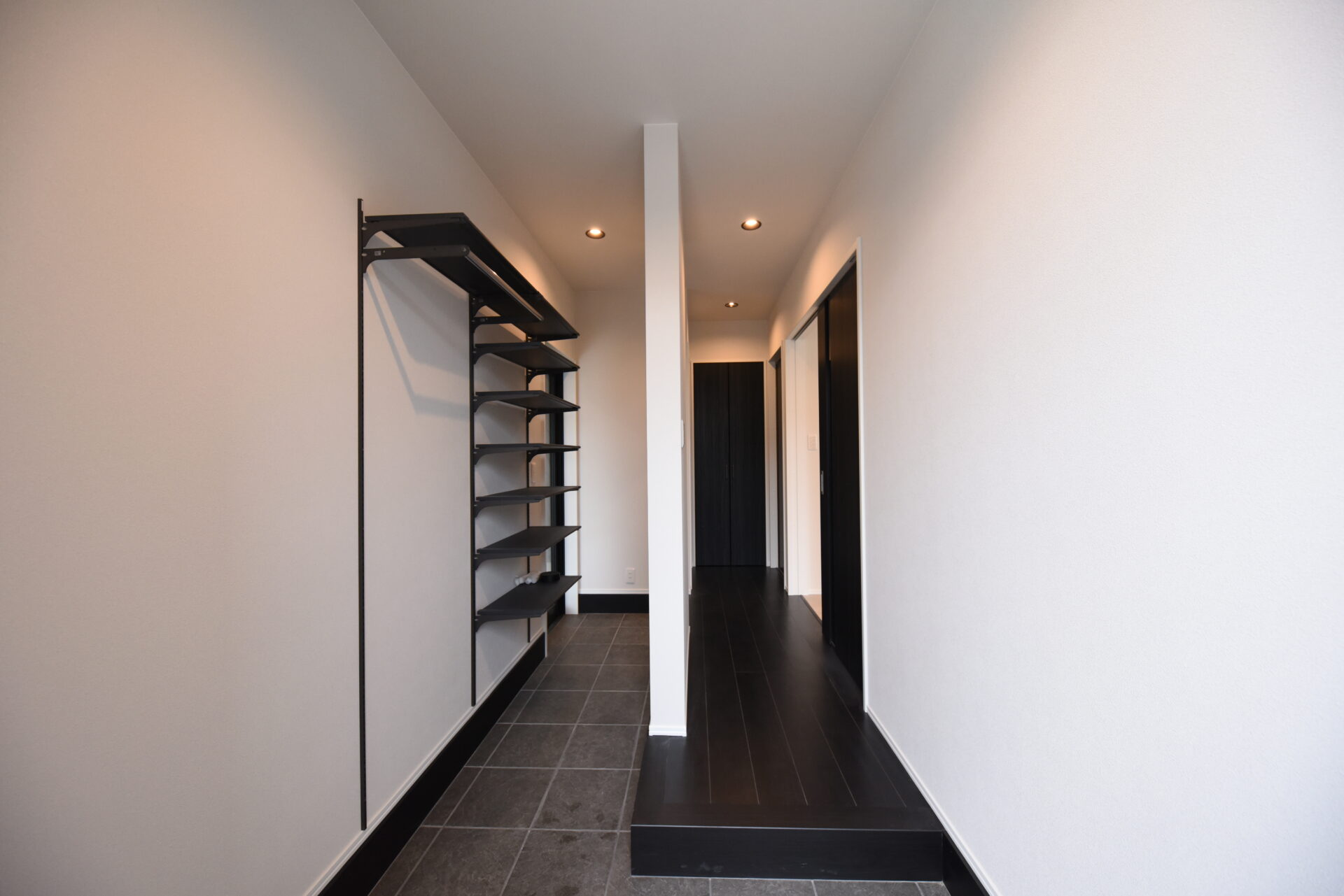 メイン玄関とガレージ入り口が土間でひと続きになった、混雑知らずのゆとりある設計。家族の帰宅や買い物帰りが重なっても、スムーズに家の中へ迎え入れてくれます。